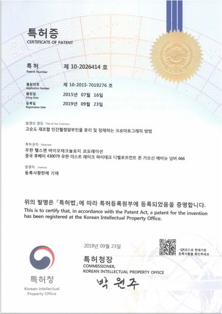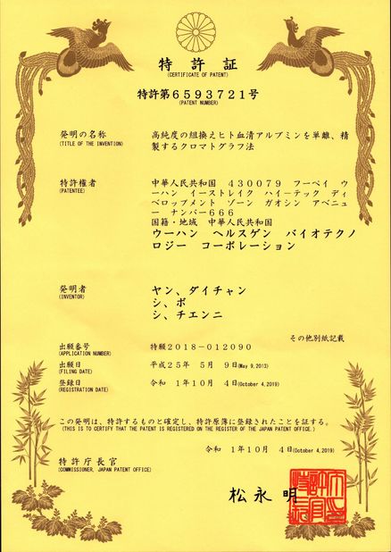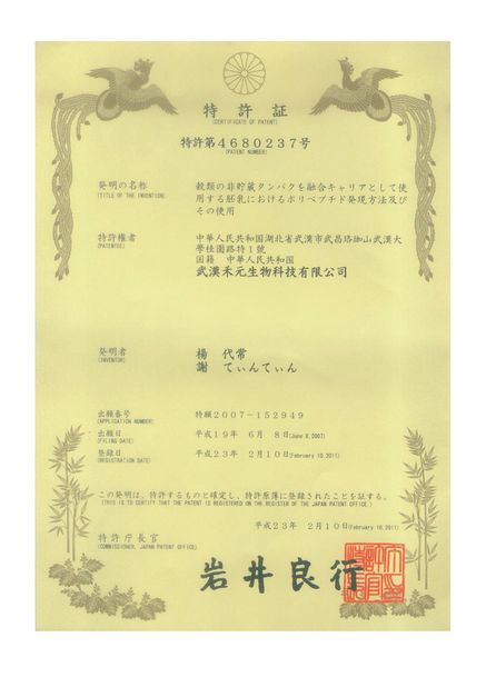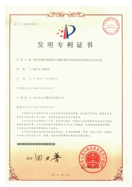 Standard:Patent Zahl:ZL200610019285.9 Heft Datum:2010-06-30 Ausgestellt von:China Patent Office |